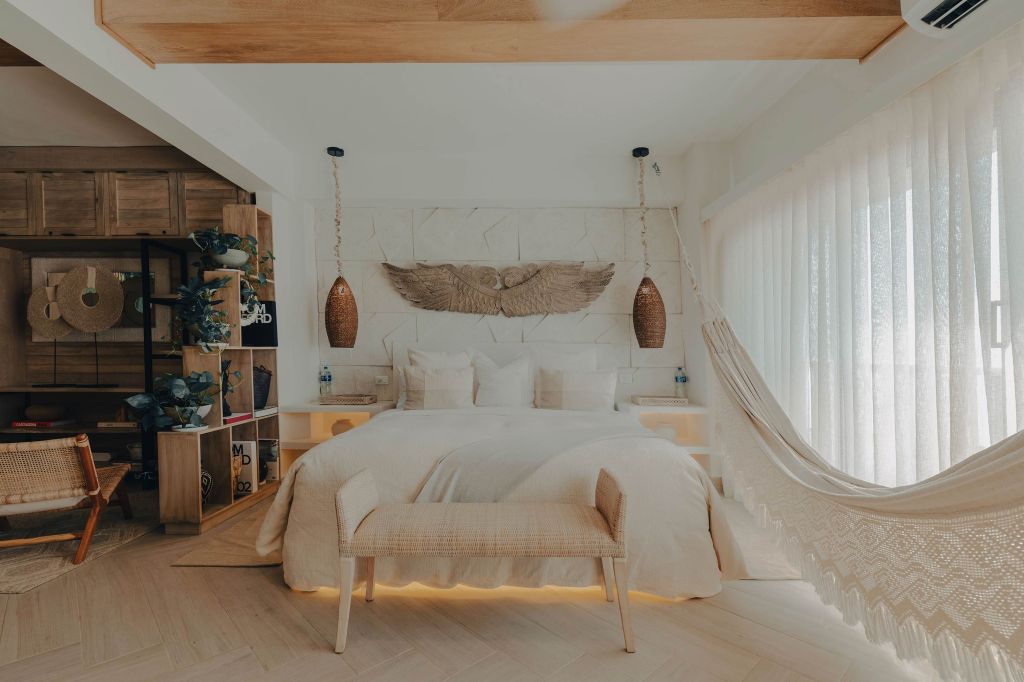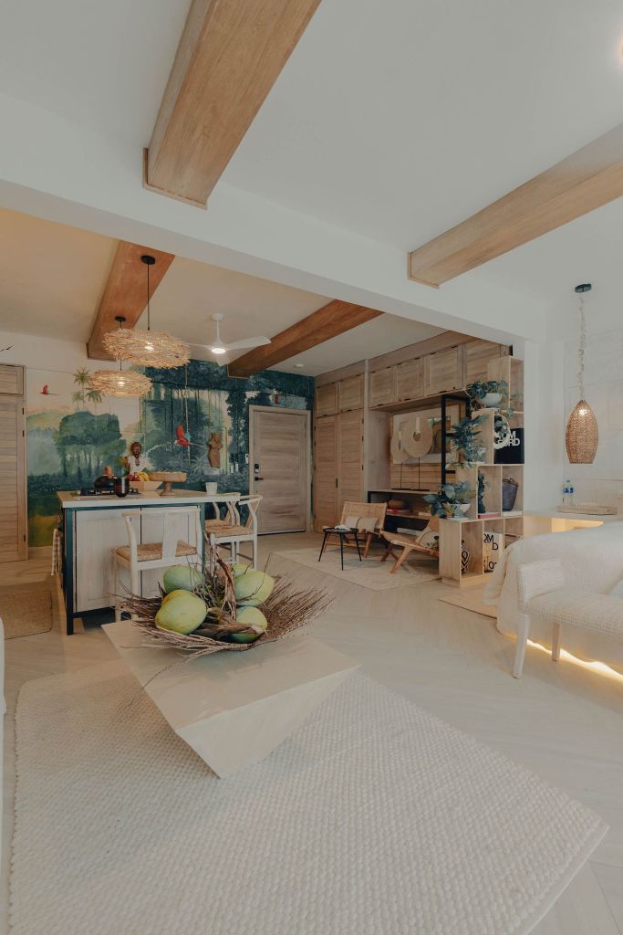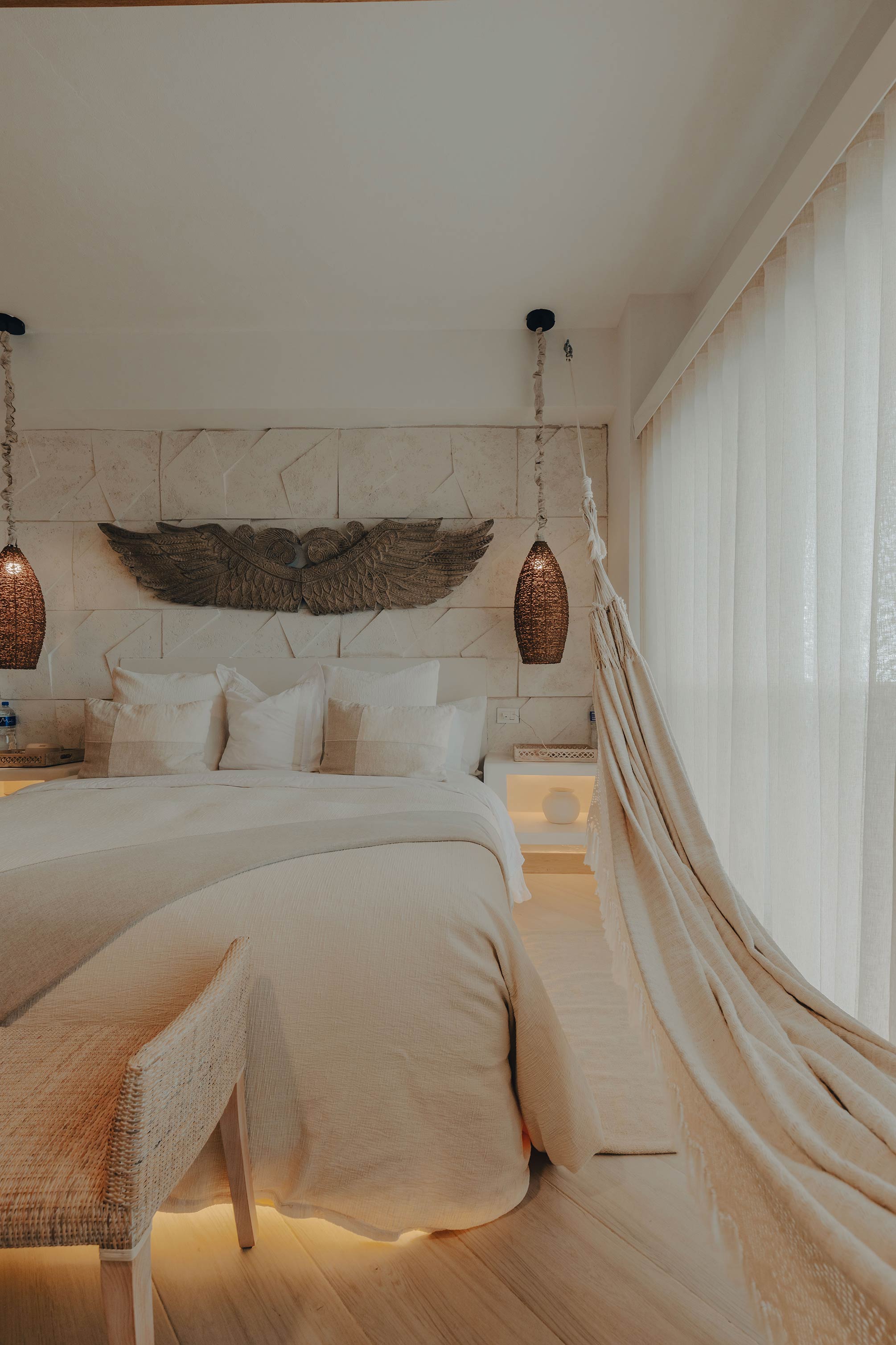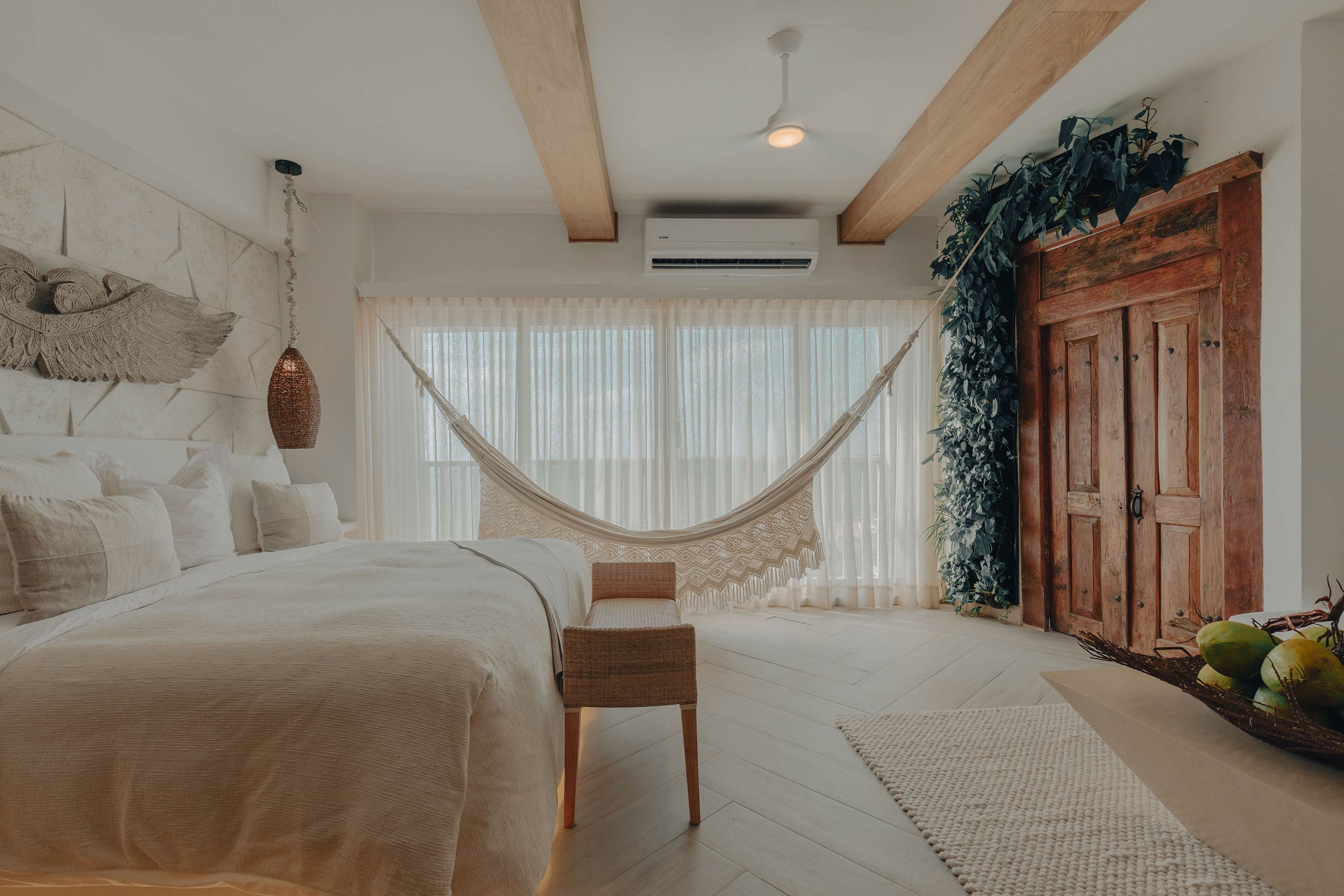 Lino: Los textiles de lino en cortinas, cojines y tapicería añaden una sensación de ligereza y frescura, además de una hamaca tejida aporta tradición a la experiencia y demuestra que estos materiales son duraderos y sostenibles.