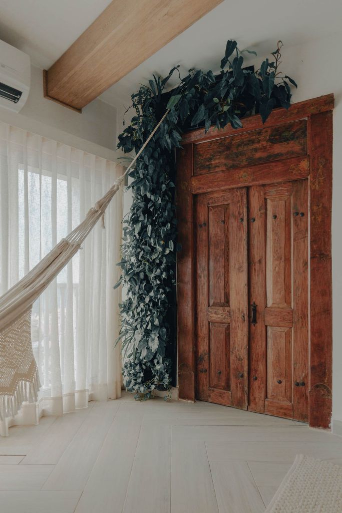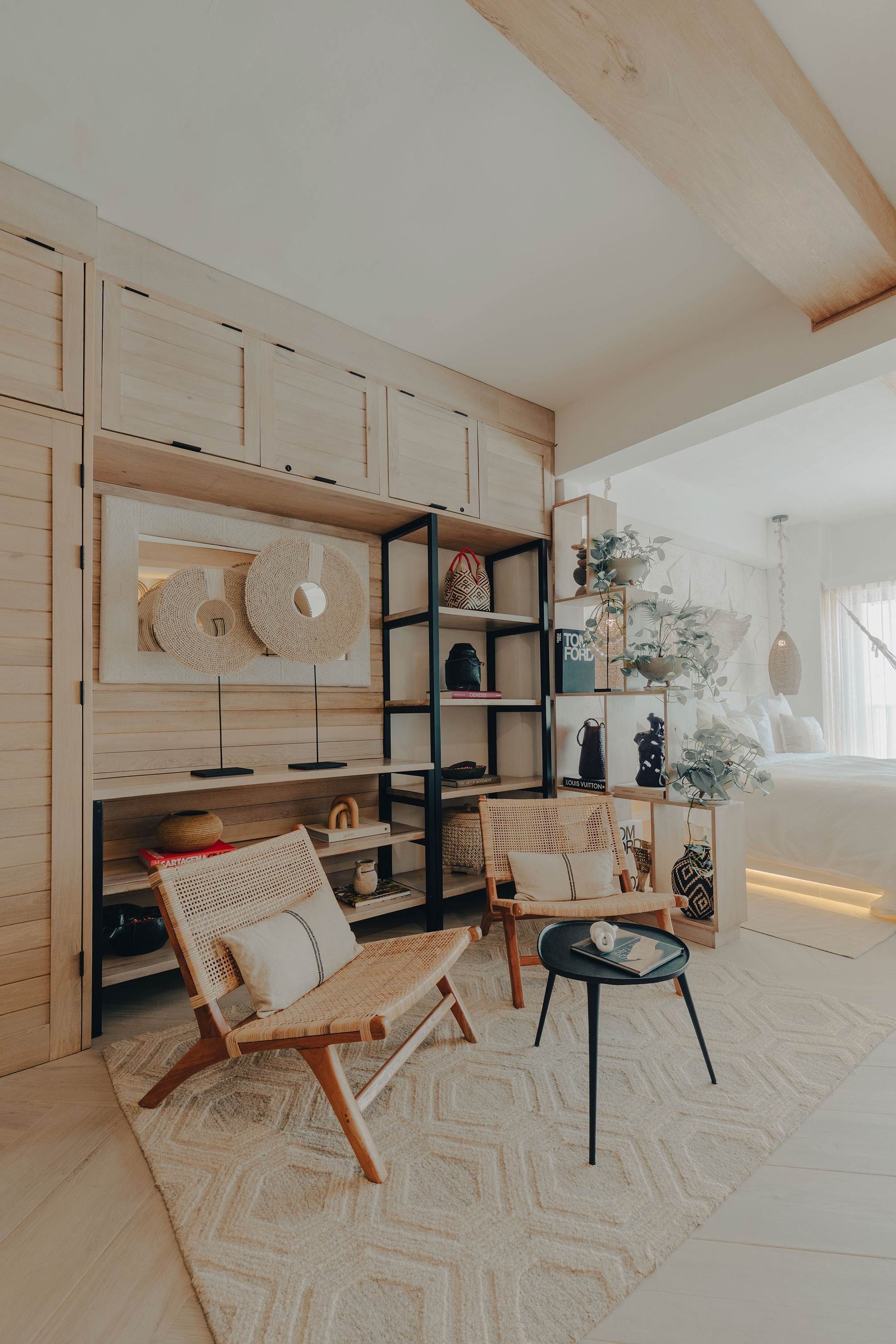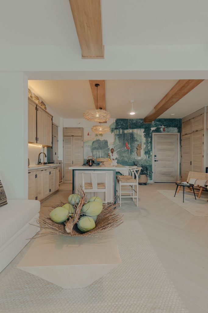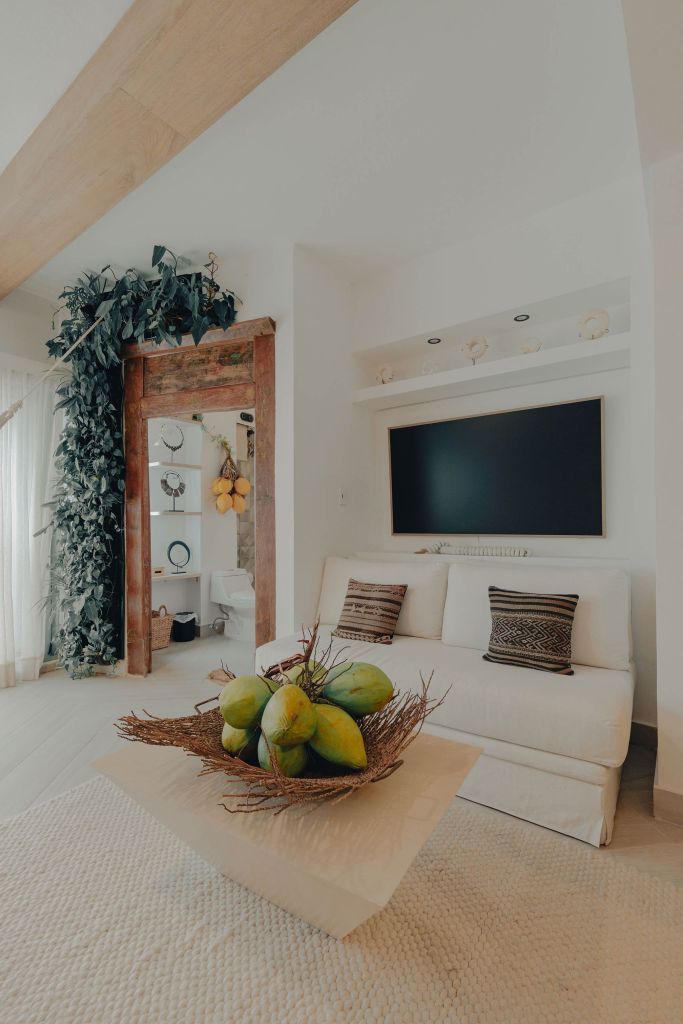 Lino: Los textiles de lino en cortinas, cojines y tapicería añaden una sensación de ligereza y frescura, además de una hamaca tejida aporta tradición a la experiencia y demuestra que estos materiales son duraderos y sostenibles.