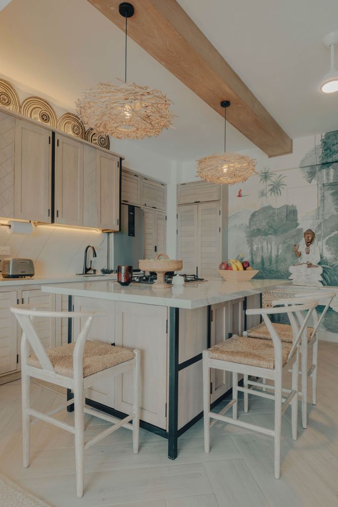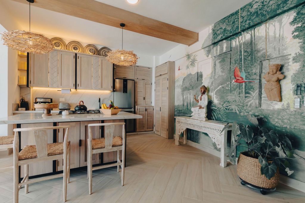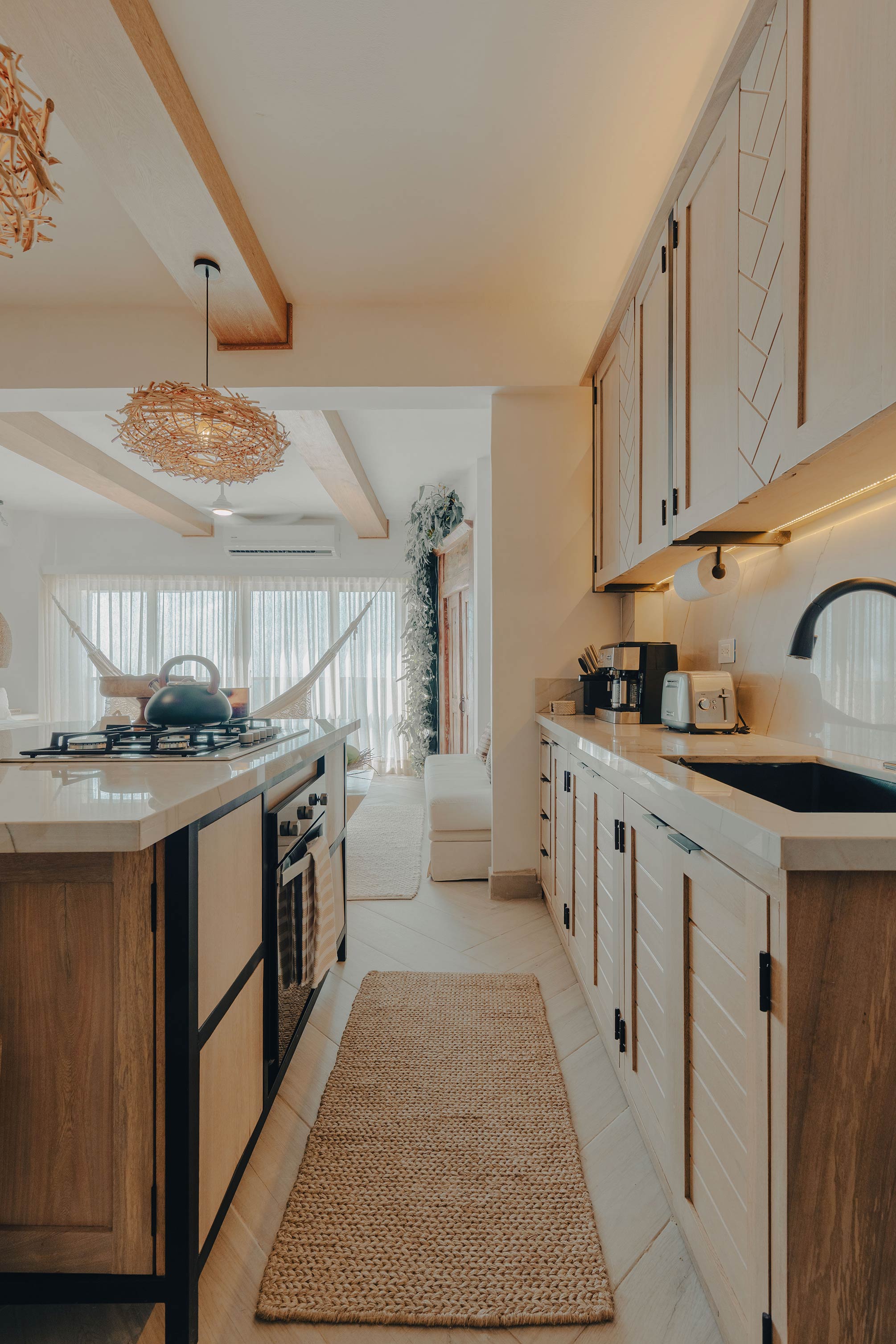 Accesorios: Detalles de cocina en metal, aparatos eléctricos que añaden un toque de sofisticación y armonizan con los tonos cálidos predominantes.