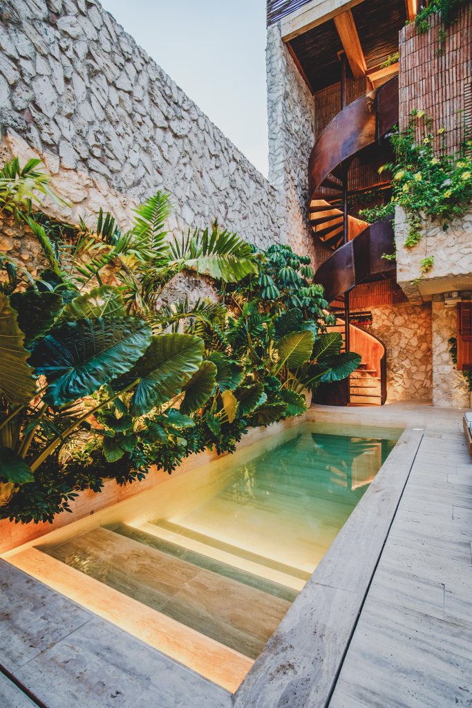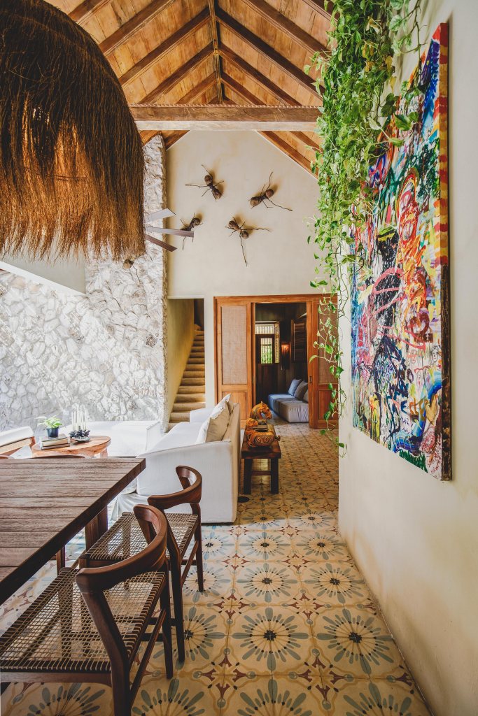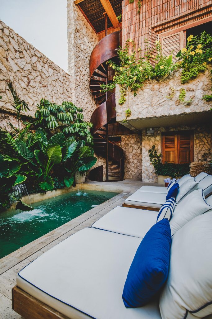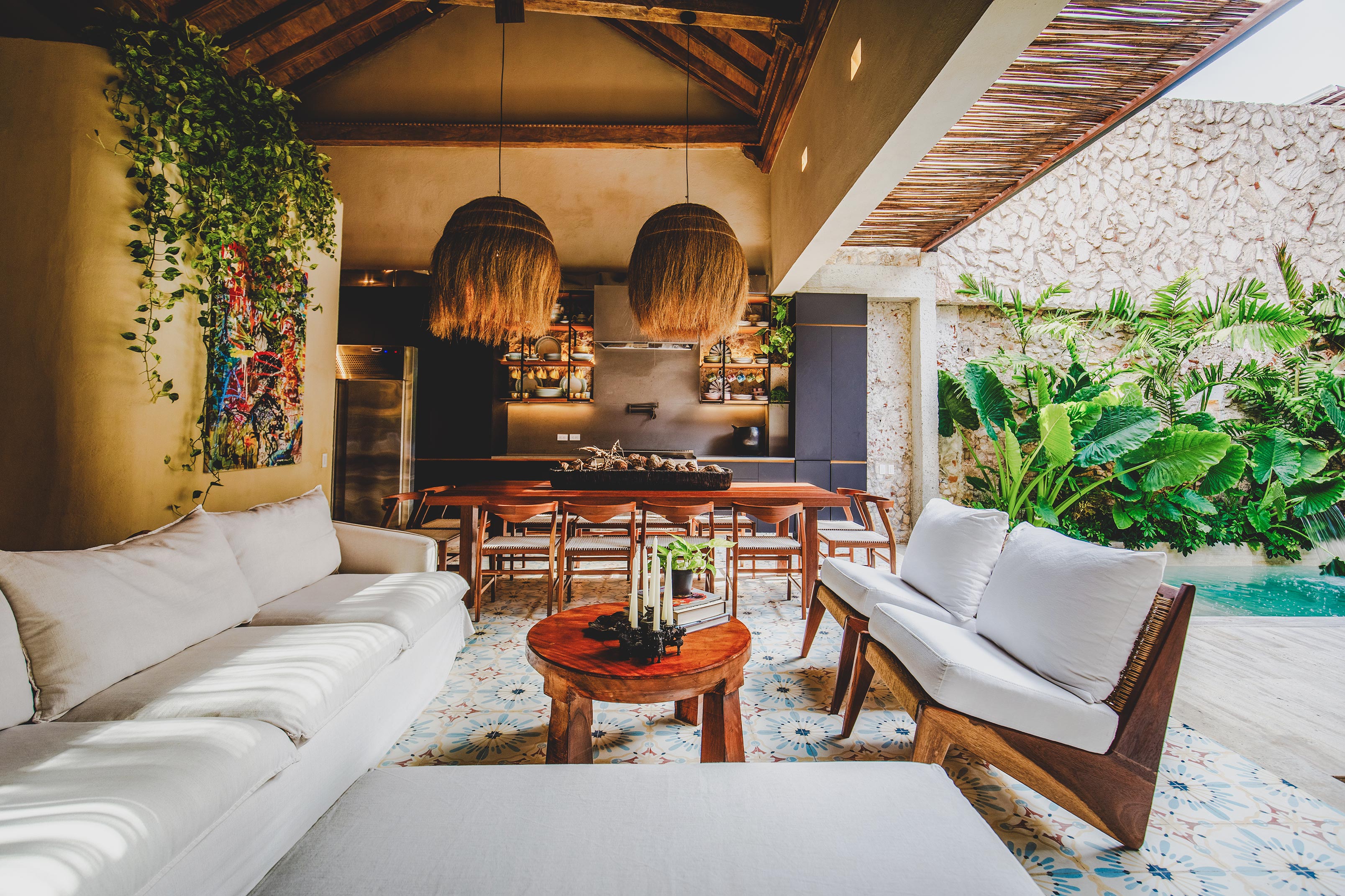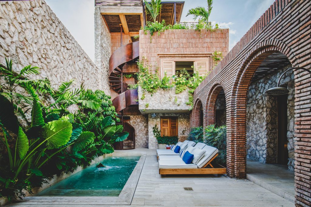Ese gesto de reiteración material se traduce en una sensibilidad táctil y atmosférica. El ladrillo absorbe la luz intensa del Caribe y la devuelve matizada; su porosidad contrasta con la tersura del agua en el patio; su densidad se enfrenta a la ligereza del aire que circula libremente en la casa. La materia se vuelve aquí relato: invita a sentir la arquitectura no solo como forma, sino como experiencia multisensorial.