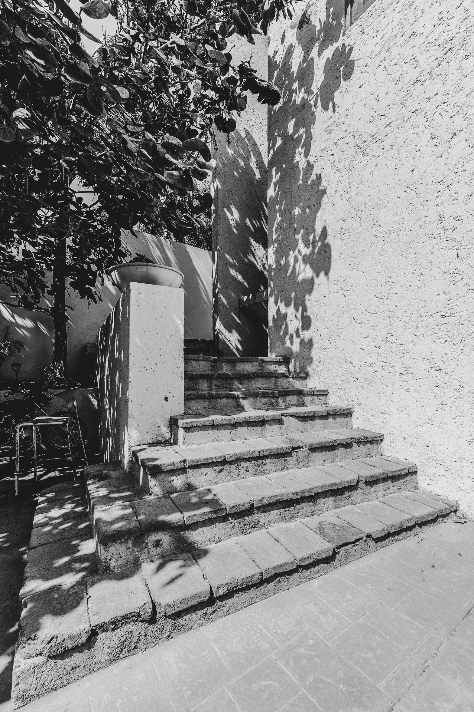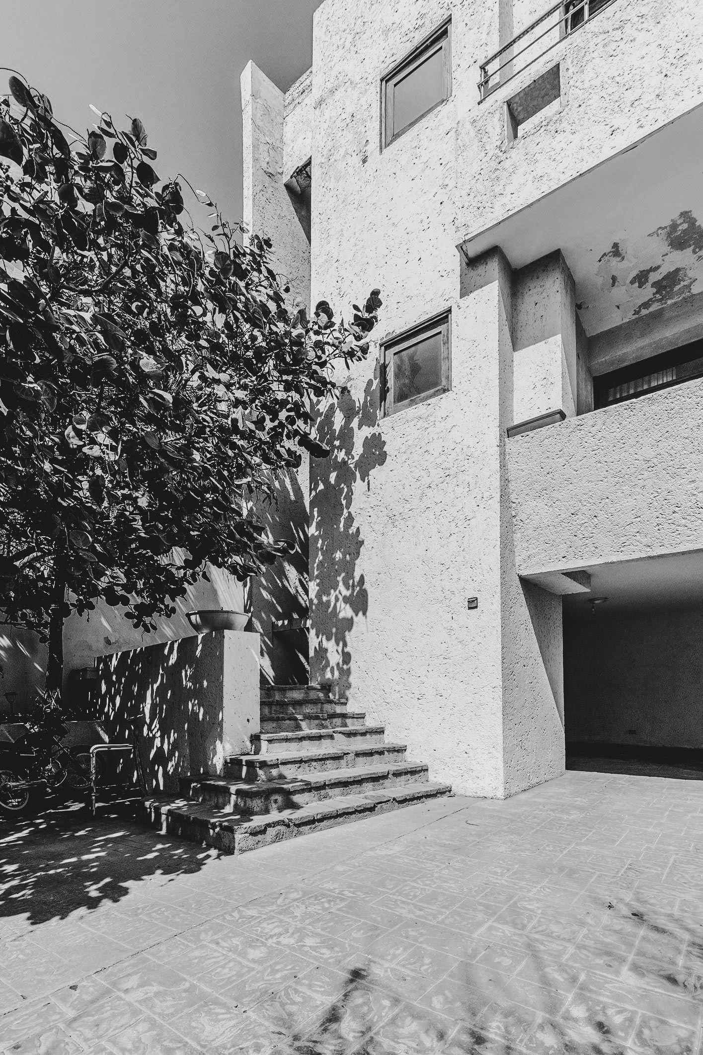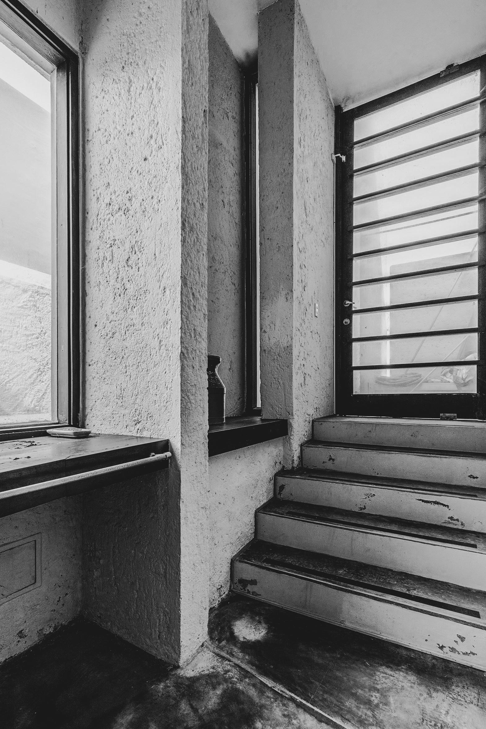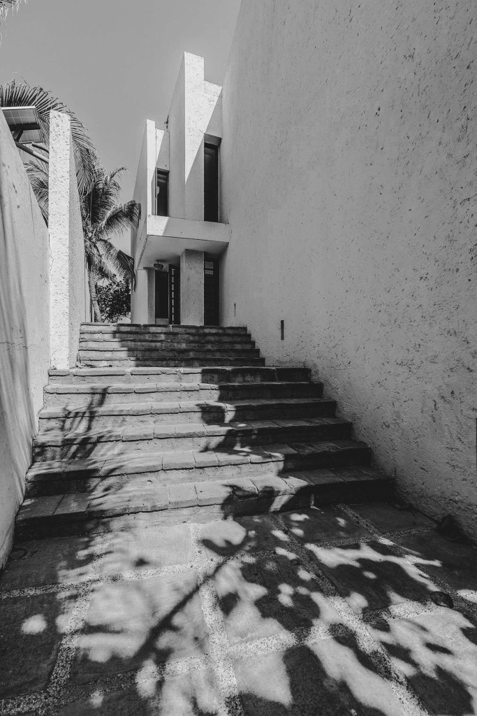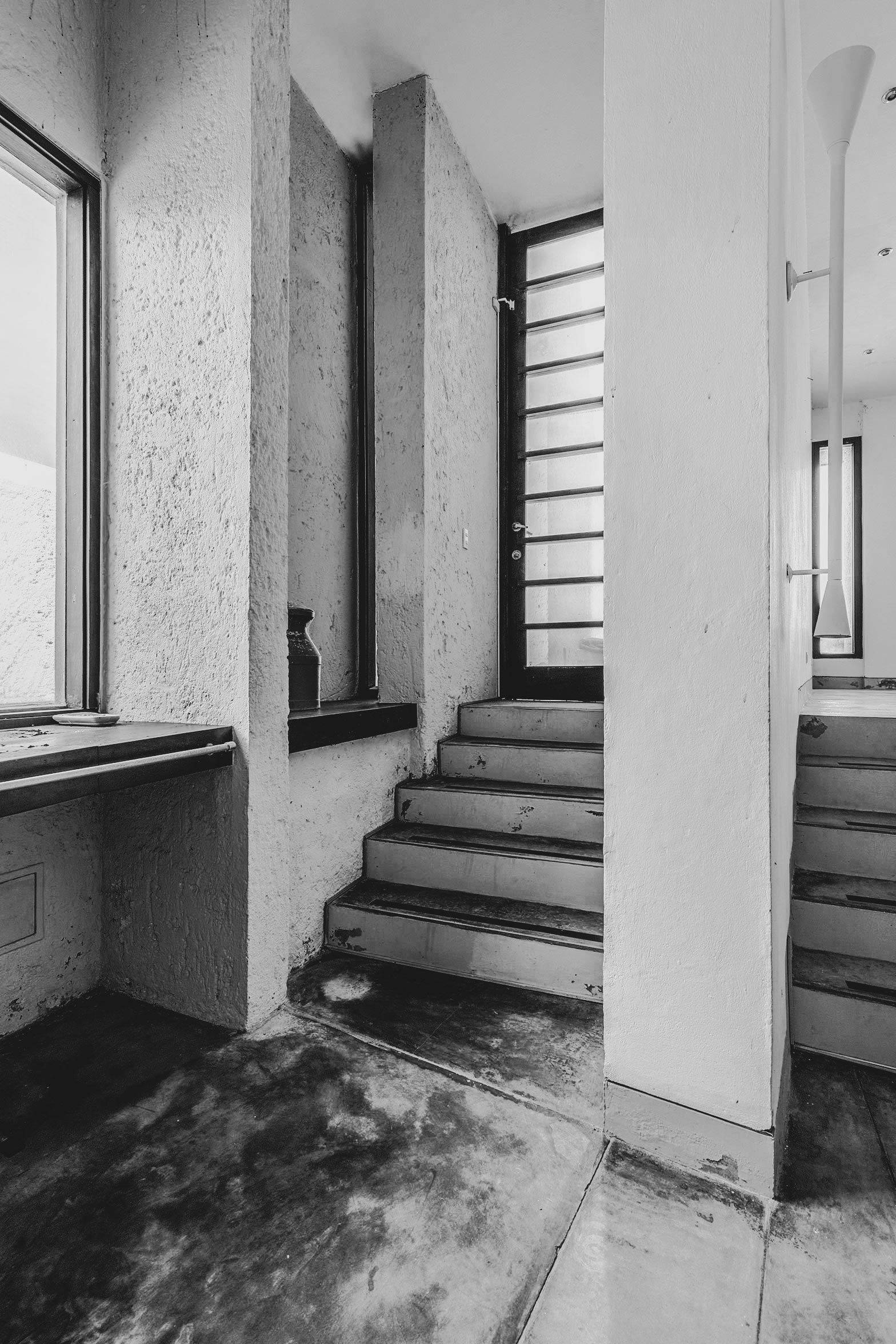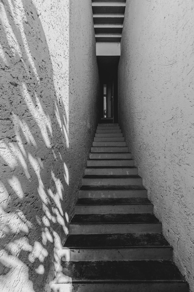 Escalera auxiliar que asciende desde el parqueadero, poesía de aberturas y giros que sugieren cambios de perspectiva.